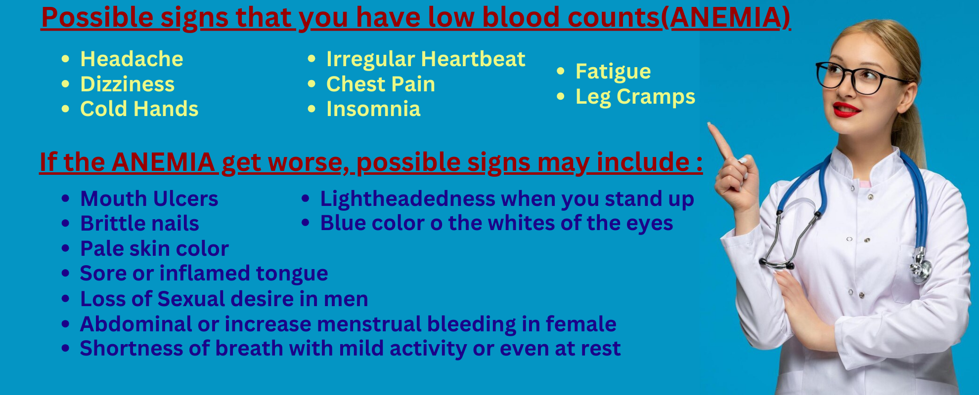 When an individual is told that they have a low blood count which is often referred to as Anemia, what is simply means is that they have fewer Red Blood Cells, fewer White Blood Cells, fewer Platelets in the body than what is considered to be normal